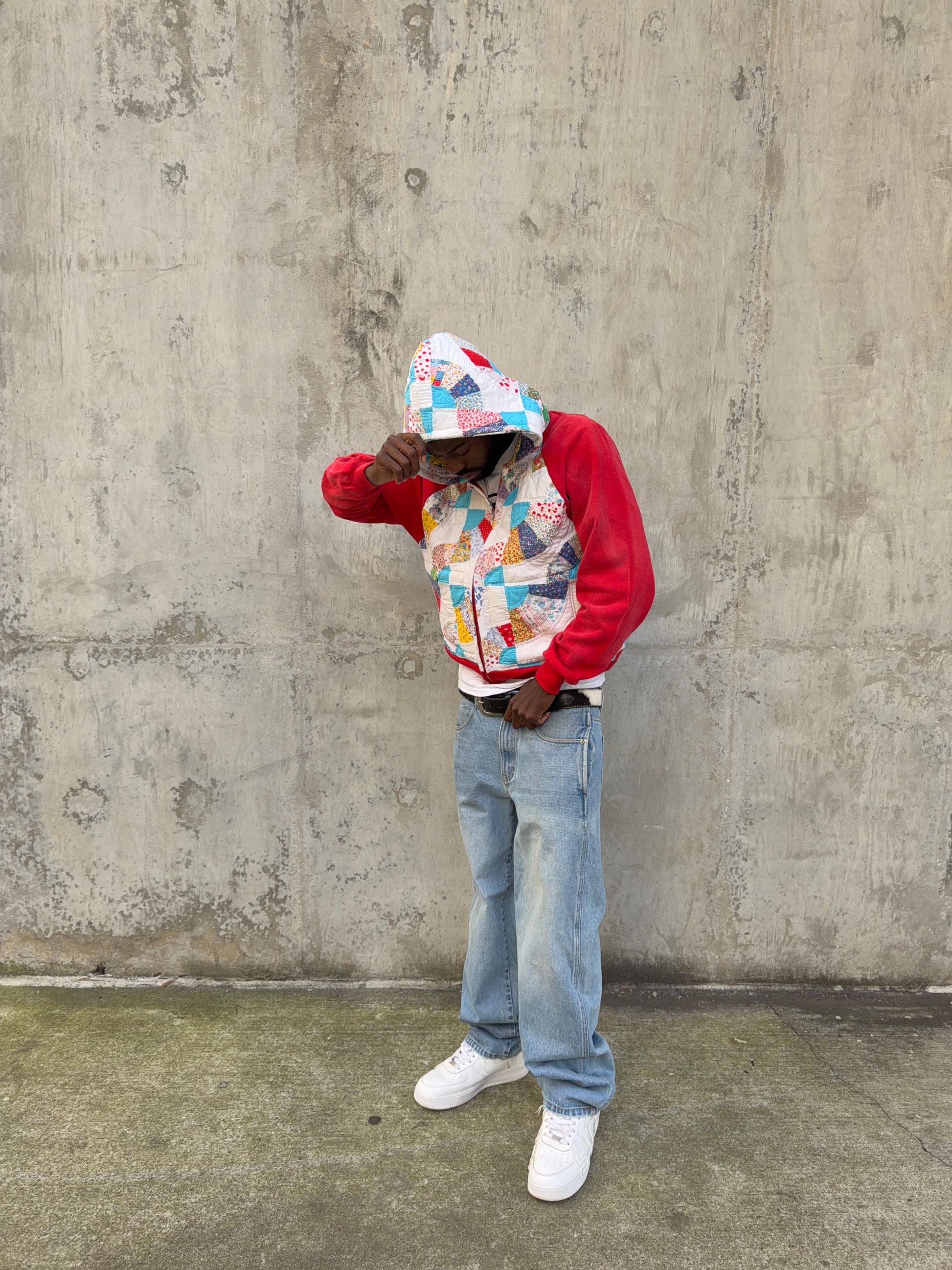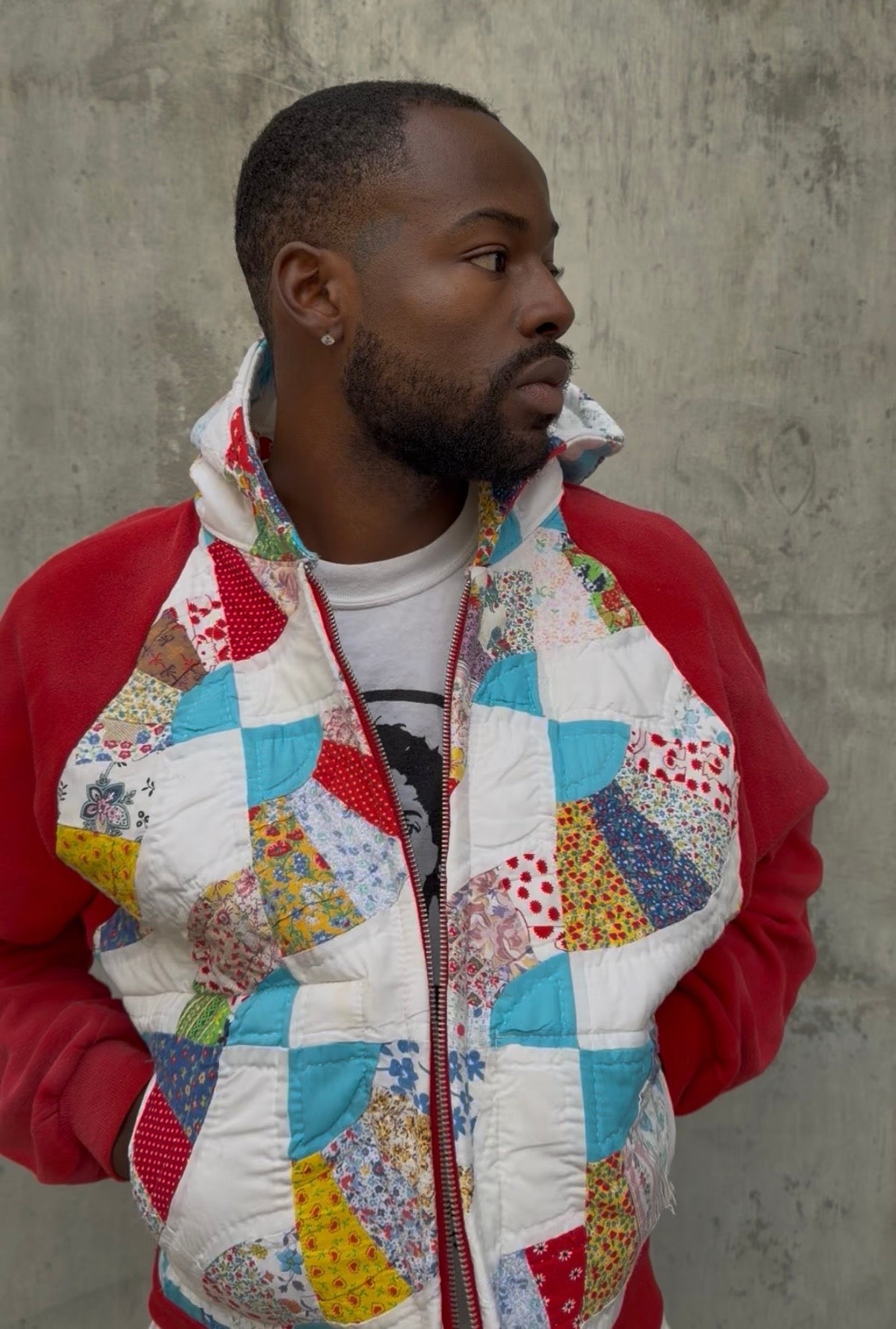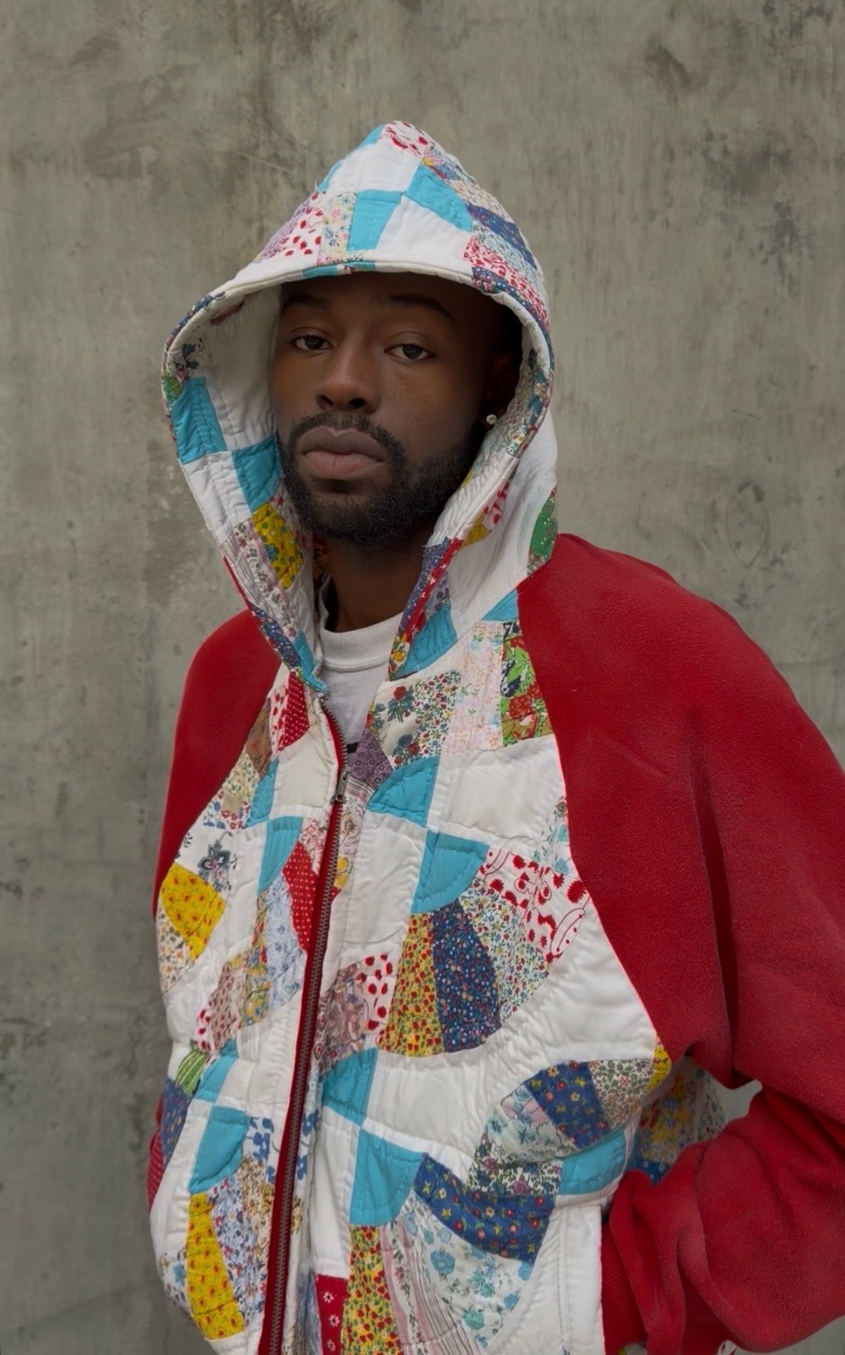Story: Crafted from an authentic 1930s quilted blanket, this zip-up breathes new life into history. Embedded within the garment is a deeper story—a testament to transformation. What was once worn, forgotten, and aged has been renewed, echoing the biblical theme of being reborn: The silhouette draws inspiration from the effortless lines of a ’90s raglan crewneck, merging nostalgia with quiet modern refinement. Sun-faded reds, hand-stitched patchwork, and weathered textures come together in a piece that feels lived-in yet artfully reimagined.Each stitch symbolizes restoration, a reminder that what has endured time can rise again with purpose.