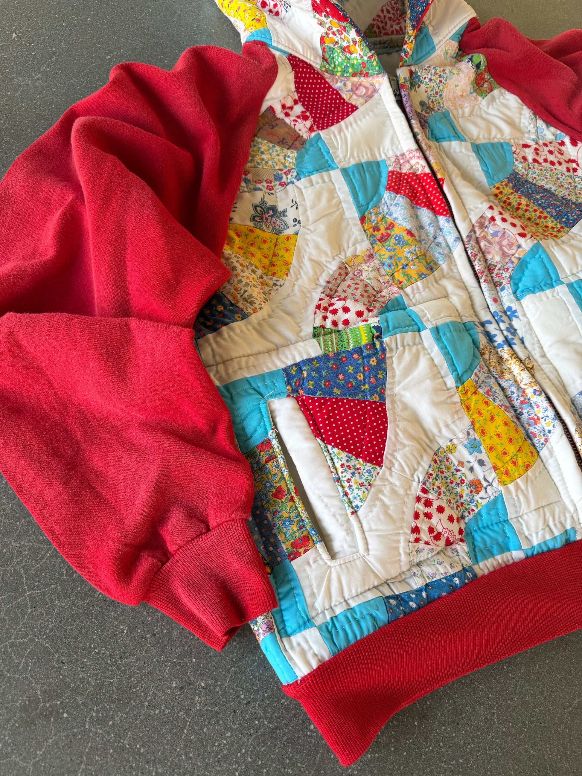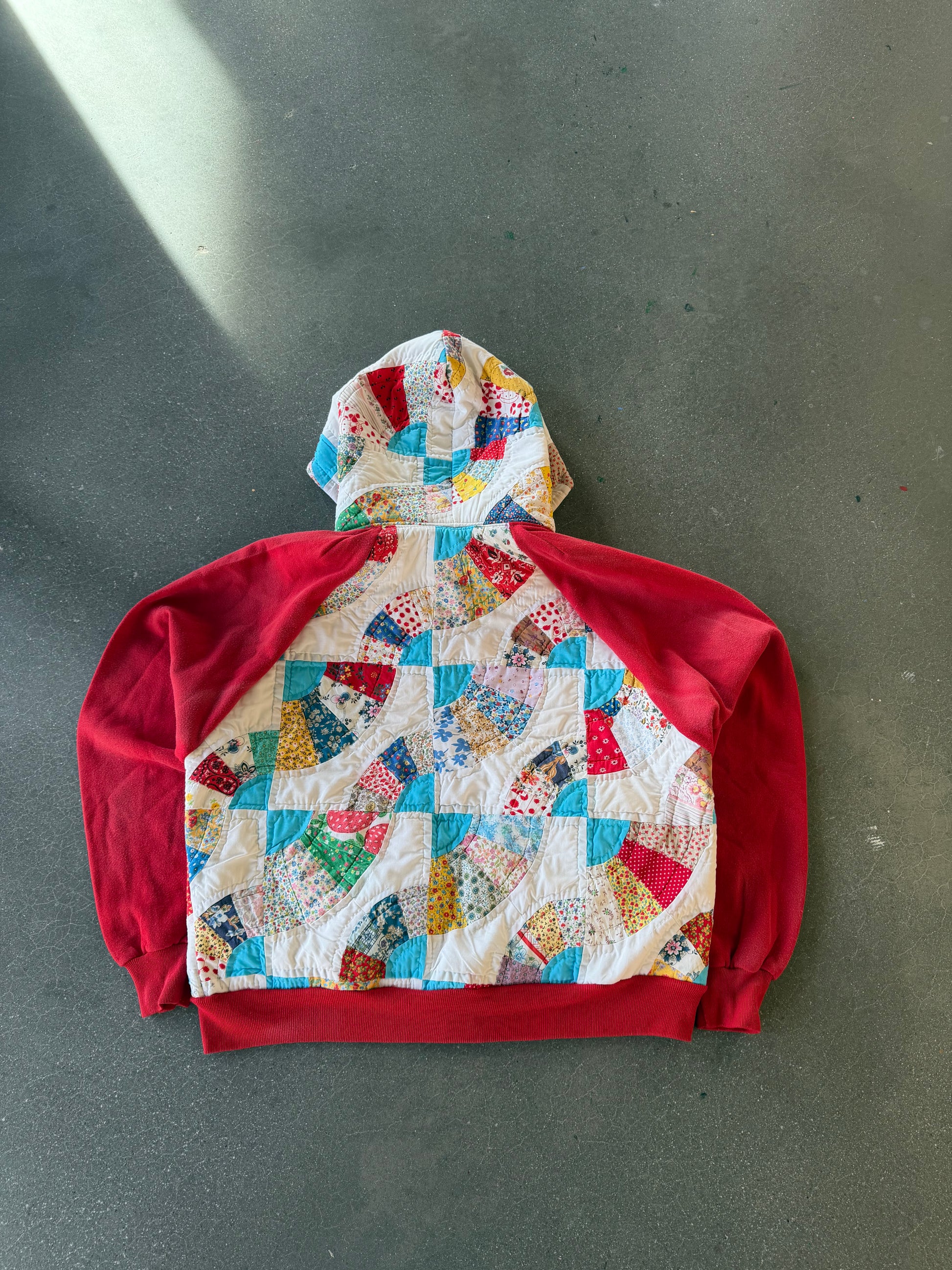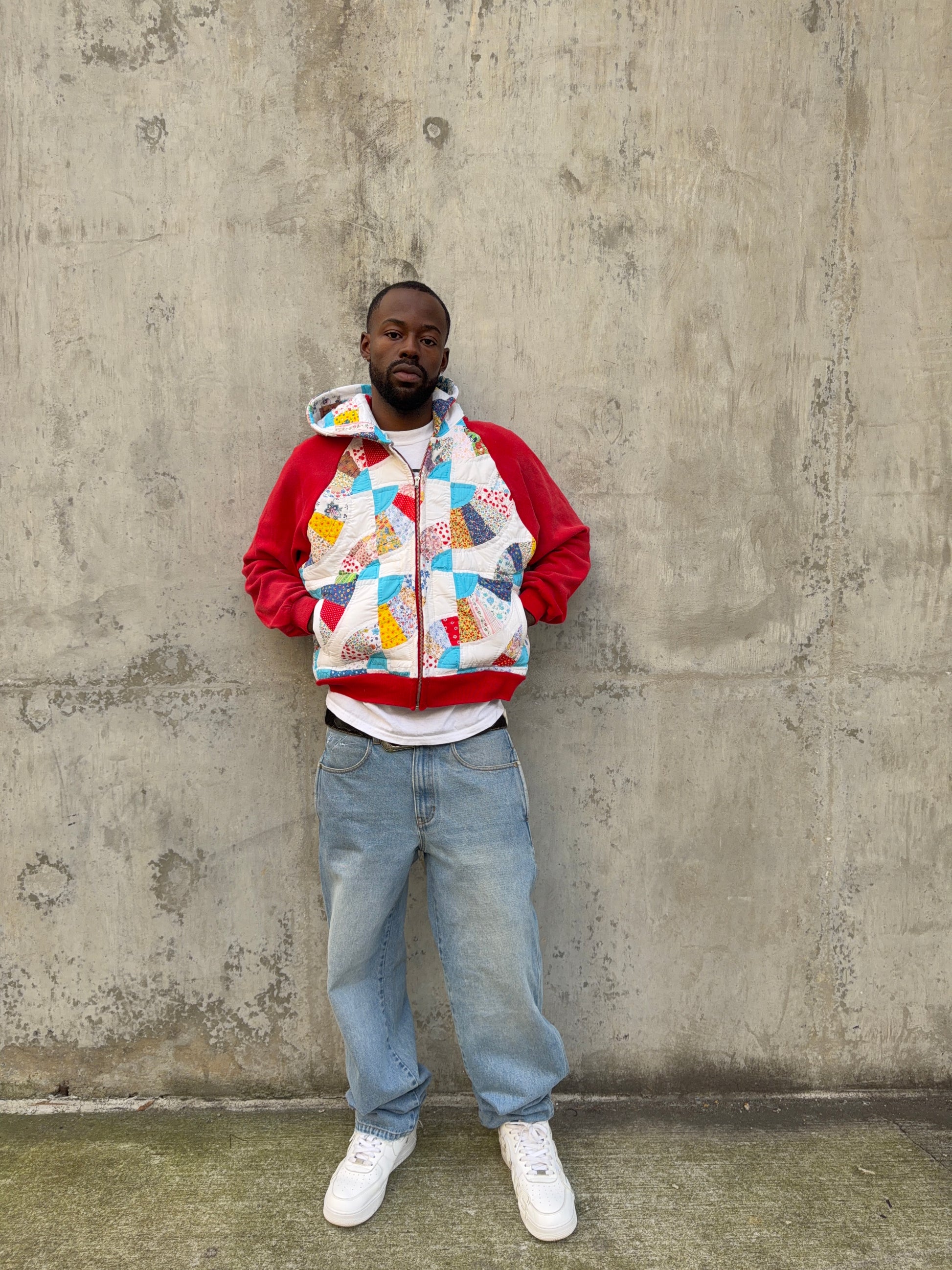 Story: Crafted from an authentic 1930s quilted blanket, this zip-up breathes new life into history. Embedded within the garment is a deeper story—a testament to transformation. What was once worn, forgotten, and aged has been renewed, echoing the biblical theme of being reborn: The silhouette draws inspiration from the effortless lines of a ’90s raglan crewneck, merging nostalgia with quiet modern refinement. Sun-faded reds, hand-stitched patchwork, and weathered textures come together in a piece that feels lived-in yet artfully reimagined.Each stitch symbolizes restoration, a reminder that what has endured time can rise again with purpose.